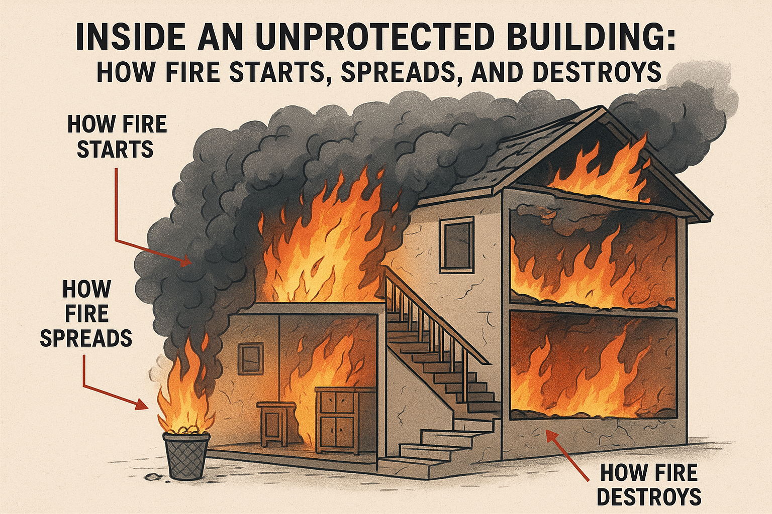 Once ignition occurs, the speed and direction of fire spread depend on the building’s design, materials, and safety measures. In an unprotected structure, the pathways are wide open.